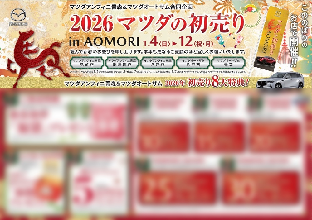「2026マツダの初売り in AOMORI」は1/4(日)~12(月)まで青森県内のマツダオートザム各社さんと合同で開催いたします。