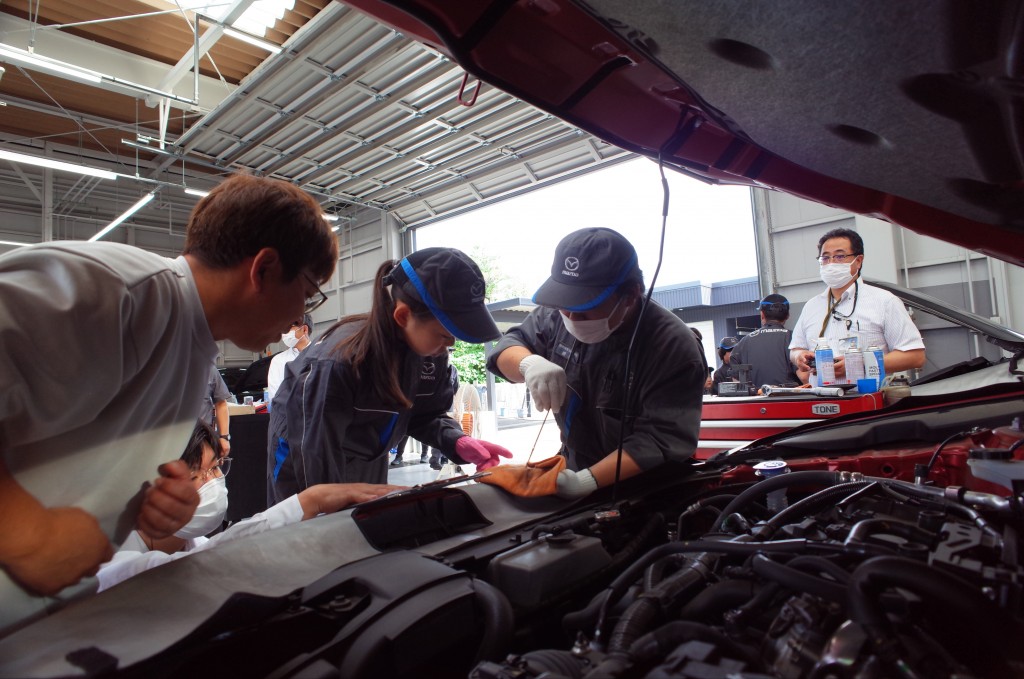 恐らく初めて着るマツダのつなぎへの着替えに苦戦しつつも、工場で整備の実体験です!